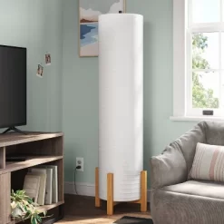 Update your living space with the help of this brushed nickel finish floor lamp. The design is crafted from metal, and has a chic contemporary look thatās paired with a beautiful beige fabric drum shade. It comes with twin pull chains that rev up the style factor and make it easy to control the light output.