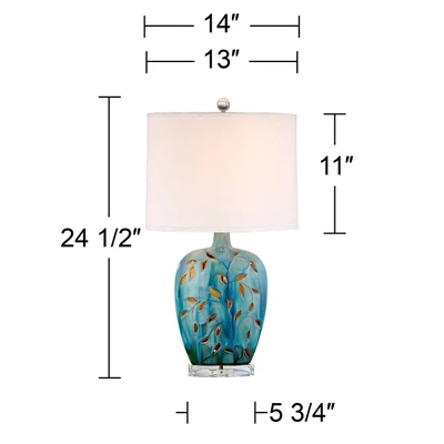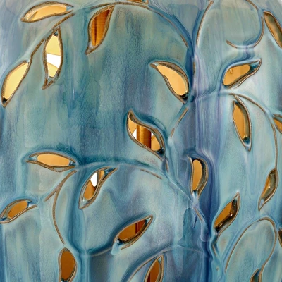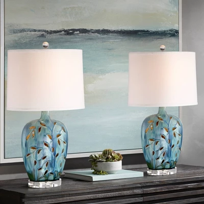 Delicate leaves dance over the shapely bodies of this set of two modern ceramic table lamps with nightlights. This pair from the Devan Vines collection by 360 Lighting exemplify artistry in function with a tasteful design and blue ceramic lamp body featuring a decorative open hole leaf pattern. Set atop a clear acrylic base and topped with an oval shade, this lamp set creates a beautiful way to illuminate a modern room.