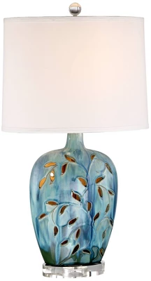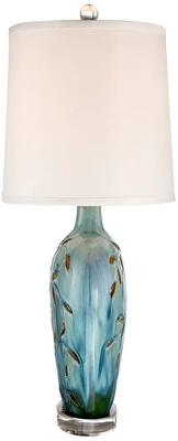 - Blue ceramic lamps with a decorative open hole leaf pattern. Clear acrylic accent footer at bottom.