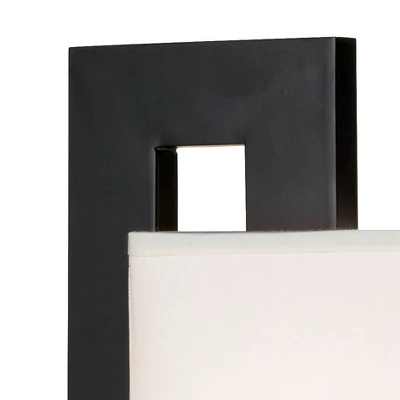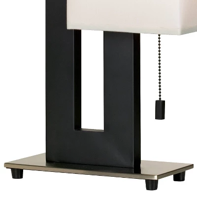 We love this set of two black and brushed nickel finish accent table lamps for its bold, geometric looks and simplicity. The modern and contemporary rectangle base is in a brushed nickel finish. A white rectangle shade sits offset on the black finish vertical stands. A single light pull turns the lamp on and off.