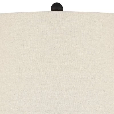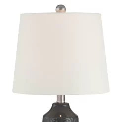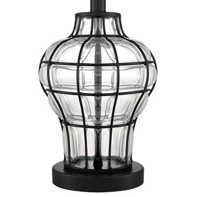 An unusual yet versatile design from the 360 Lighting brand. In a two-piece set, these transitional table lamps come in a dark bronze finish metal frame of intersecting lines, which encases a clear glass gourd body. On top is a burlap drum shade which adds a natural touch. Perfect for a contemporary, industrial, or nautical style setting.