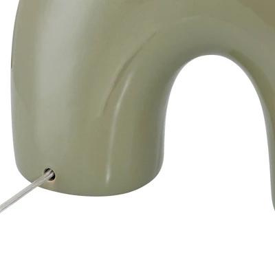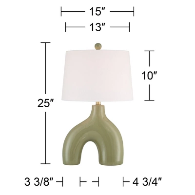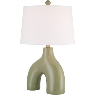 Refresh to look of your modern living space with this ceramic lamp design from 360 Lighting. Inspired by Mid-Century lighting design, the lamp base has a whimsical half-circle, two leg profile done in a lush green ceramic glaze. Up top is a tapered white fabric lamp shade.