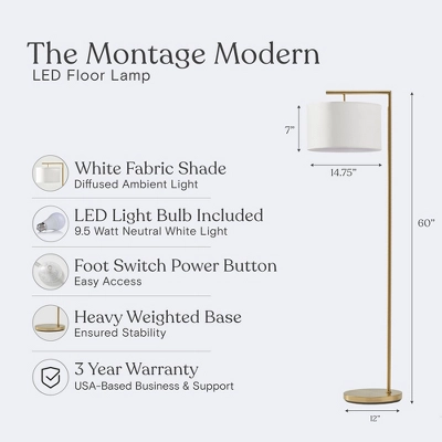 Brighten up any room with the Brightech Montage Modern LED Floor Lamp! This stylish lamp is available in black, antique brass, rose gold, or satin nickel and is perfect for Asian, Scandinavian, and contemporary décor. The included LED bulb provides 800 lumens of soft white light with a 3000k color temperature. The light-diffusing decorative shade creates the perfect ambiance for living rooms, studies, bedrooms, or offices. Plus, you can switch the replaceable bulb to one that you prefer for a dimmer or brighter look. The lamp is also compatible with smart home devices like Alexa and Siri. Assembly is easy and fast with the provided diagram and the power button is a built-in footswitch that extends out 4 feet for convenience. Tap the button on the floor to turn it on and enjoy your new lighting!