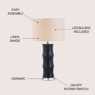 This eye-catching navy ceramic table lamp takes its inspiration from the beauty of natural bamboo. The resulting look is a perfect balance between Asian and modern styles, with a preppy flair. Nickel accents, a crystal base and a white cotton drum shade keep the look contemporary and fresh.