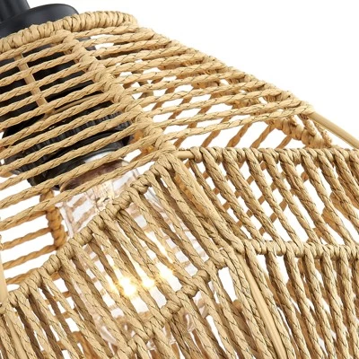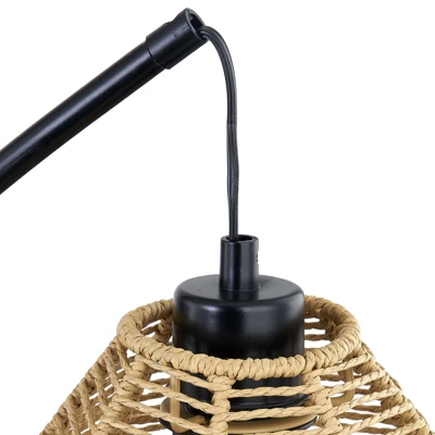 - Product Dimensions:64.33″x64.33″x76.57″,Black iron lamp body and 3 lampshades made of woven vines in the shape of water droplets.