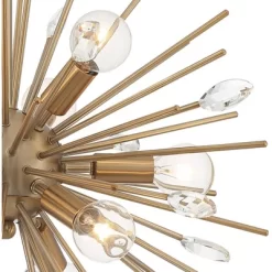 - Warm antique brass finish frame and canopy, Metal construction. Open, geometric profile inspired by modern and Mid-Century styles.
