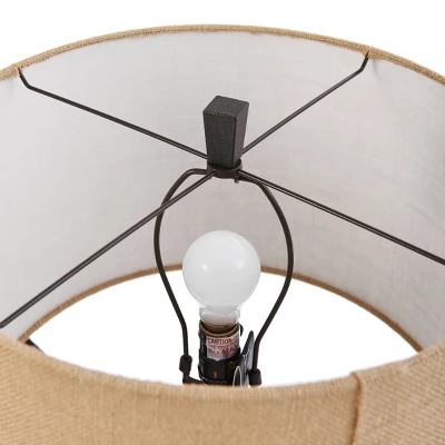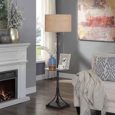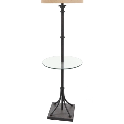 Minimalism and geometric flourishes make this modern floor lamp a stunning piece for living and guest rooms. A frame made of bronze metal stands stoically on a squared bronze base, with a circular glass table dissecting the structure and delivering a functional accent. A brown burlap drum shade surrounds the light, adding a bit of textured, natural appeal. Regardless if you put it in the bedroom or family room, this table lamp stands out. Suitable for residential use in a dry location. Due to lighting and monitor differences, actual colors and finishes may vary slightly from what appears online.
