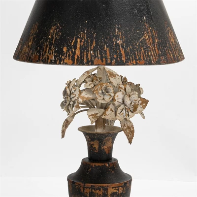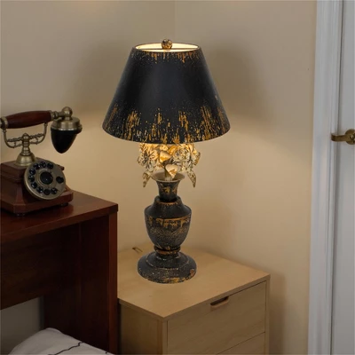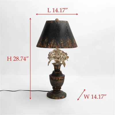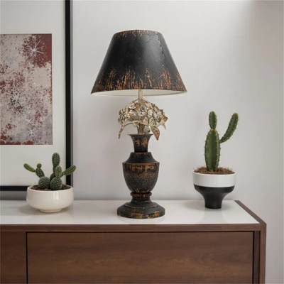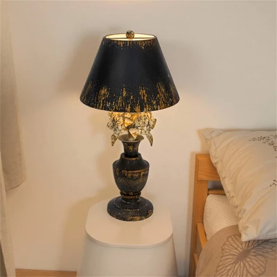This vintage table lamp features a bold black base with a distressed finish, making it a unique table lamp or bedside lamp perfect for shabby chic decor or farmhouse lamps. Its rustic style lamp design, with an urn-shaped base adorned with decorative floral elements, offers an antique charm suited for a bedside table lamp or dormitory desk lamp. The art deco table lamp influence adds a touch of elegance, while the conical shade painted in matching distressed black complements the overall aesthetic. Ideal as a desk lamp, table lamp, or bedroom lamp, this versatile piece combines layered textures and finishes to create a standout vintage or rustic style lamp for any living space.