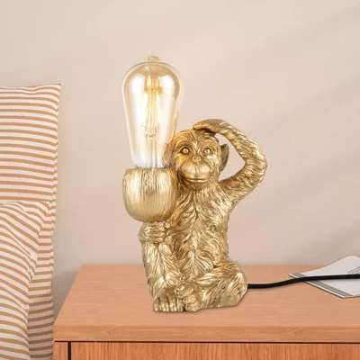 This charming sitting monkey table lamp combines playful artistry with practical lighting, making it a delightful addition to any room. Handcrafted with detailed painting and carving techniques, the resin monkey figure brings a whimsical yet royal touch to desks, bedside tables, or living spaces. Its open design accommodates a 60W E26 bulb (not included), casting a warm and luminous glow across areas up to 107 ft². Sturdy, rust-resistant, and easy to clean, this lamp is built for long-term use. With a compact footprint, user-friendly switch, and extended power cord, it’s both functional and decorative—perfect as a unique gift or standout decor piece.